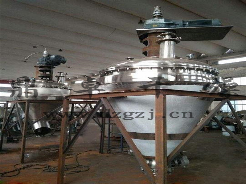 本機(jī)由加熱錐體設(shè)有加熱夾套,熱源為熱水、導(dǎo)熱油或低壓蒸汽,從而使錐體內(nèi)壁保持一定的的溫度。變頻調(diào)速電機(jī)經(jīng)平行斜齒輪減速機(jī),驅(qū)動(dòng)單螺帶攪拌器旋轉(zhuǎn),帶動(dòng)物料沿錐型筒旋轉(zhuǎn)并自下而上提升,物料到達(dá)高點(diǎn)后由重力和慣性作用,自動(dòng)流向旋渦中心回到錐型筒體底部,整個(gè)過程使物料在錐型筒體內(nèi)強(qiáng)制加熱,相對(duì)對(duì)流、摻混,熱量在物料中相互擴(kuò)散,使物料作全方位的不規(guī)則往復(fù)運(yùn)動(dòng),完成物料同單螺帶和筒壁表面進(jìn)行高頻率傳熱交換,在短時(shí)間內(nèi)達(dá)到加熱干燥的效果。從而使物料內(nèi)部水份不斷蒸發(fā),在真空泵的作用下,水蒸汽由真空泵引出,如須回收液體可加冷凝器、回收液儲(chǔ)罐回收。干燥完成后,打開下部的出料閥出料。