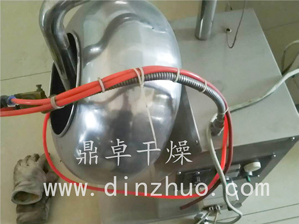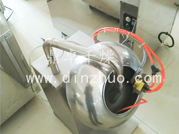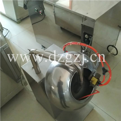 通過(guò)鍋體順時(shí)針旋轉(zhuǎn),使糖衣片在鍋內(nèi)翻滾滑移摩擦研磨,通過(guò)人手潑入糖衣粉末,使糖衣粉末在全部素片上均勻分布,隨機(jī)附帶的電熱式鼓風(fēng)機(jī),出風(fēng)管伸入球內(nèi)可作加熱,同時(shí)鼓風(fēng)機(jī)向鍋內(nèi)層通以熱風(fēng)除去片劑表層水份,從而得到僵格的糖包衣藥片。